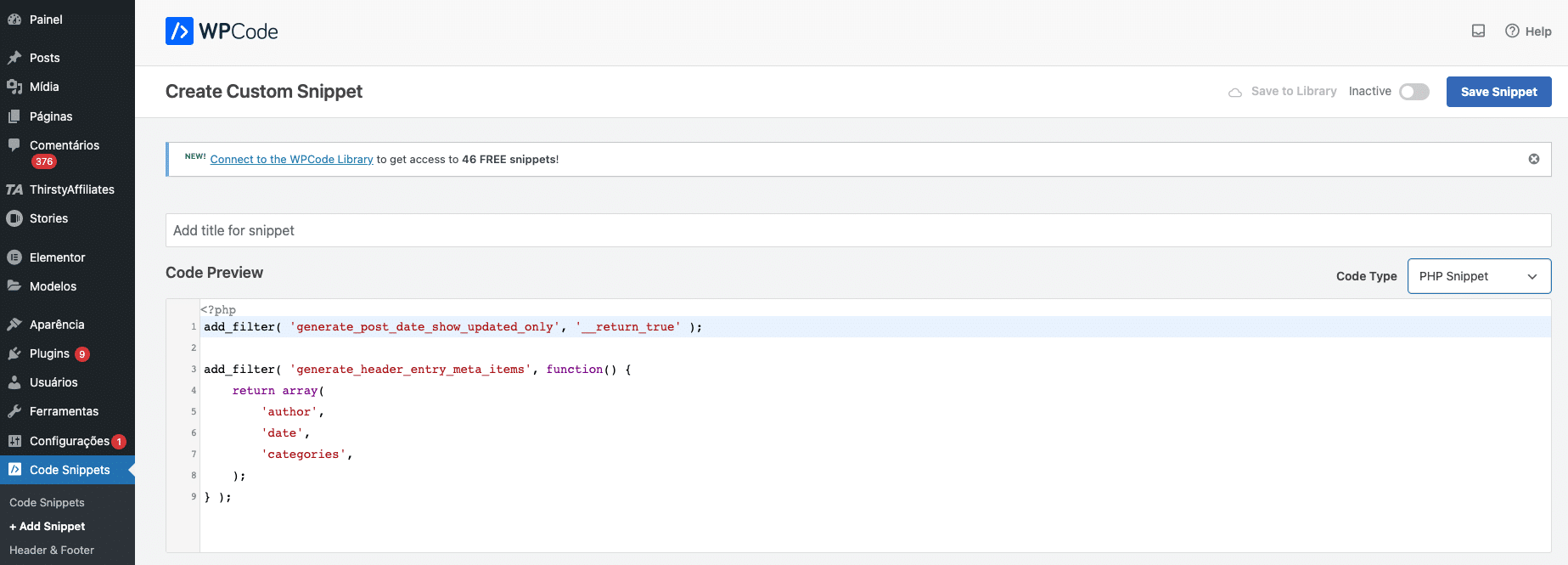 Para inserir um snippet PHP, basta acessar o arquivo functions.php do seu tema, e colar o código no final dessa página.